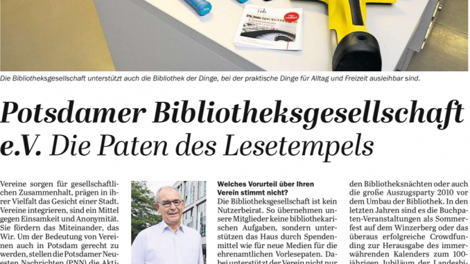 „Vereinsmeierei“ so der Titel einer Reihe der Potsdamer Neusten Nachrichten, bei der die verschiedensten Vereine in Potsdam vorgestellt wurden mit einem für alle gleichen Fragebogen. Heute erschien der Beitrag zur Potsdamer Bibliotheksgesellschaft [1].